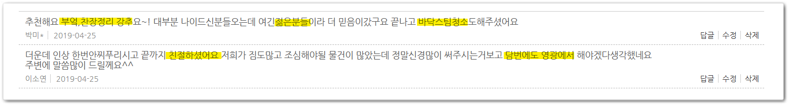 특히 신경이 많이 쓰이는 주방 정리도 주방 담당 분께서 안전하고 깔끔하게 작업 해 주십니다.